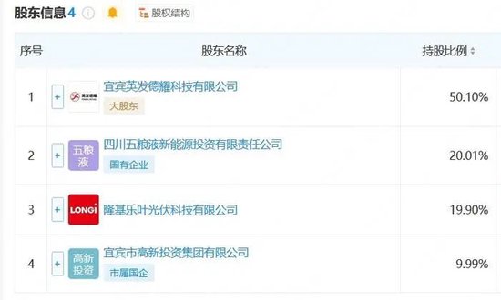 企查查显示,英发徳耀占股50.1%,五粮液新能源投资有限责任公司占比20.01%,隆基乐叶占比19.9%,宜宾市高新投资集团占比9.99%。